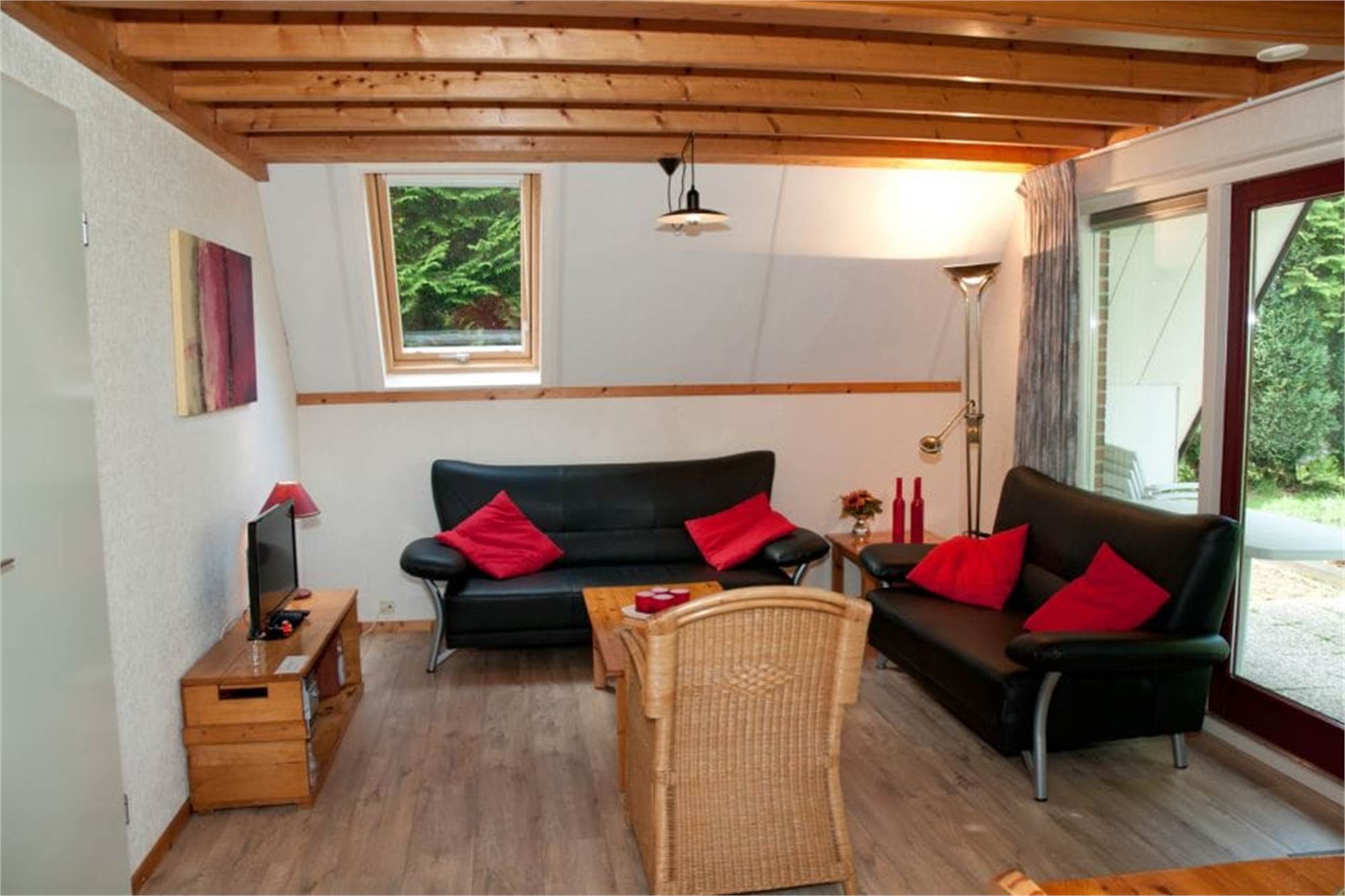Begane grond: woonkamer met een open keuken met magnetron en een zit- en eethoek. Gedeeltelijk overdekte terras. Slaapkamer met twee eenpersoonsbedden. Badkamer met douche en wastafel. Apart toilet.