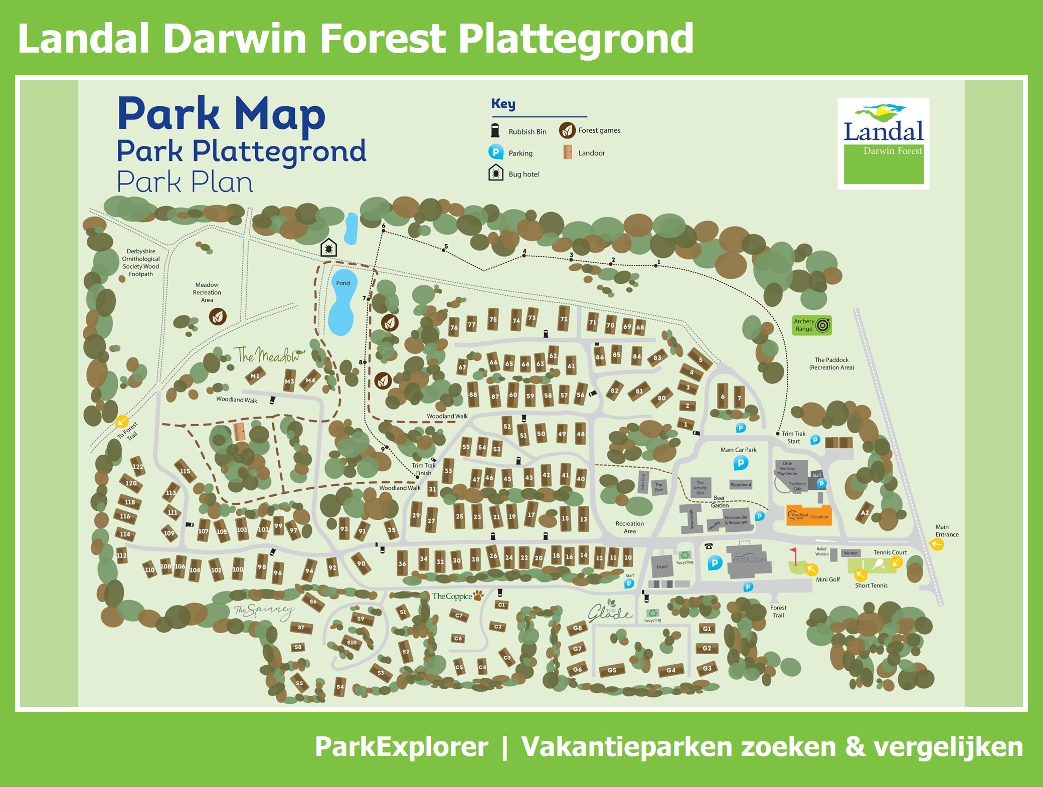De park plattegrond van Darwin Forest is niet alleen zeer handig tijdens het verblijf, maar vooral ook tijdens het boeken. De plattegrond geeft een goed beeld van de aanwezige faciliteiten en de ligging ervan op het park. TIP: Boek met voorkeursligging en kies een huisje in de buurt van de belangrijkste faciliteiten.