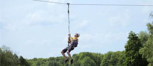 De Zip Wire is een kabelbaan van 100 meter lang en 12 meter hoog. Je scheert met een noodvaart van de ene naar de andere kant van de kabelbaan.