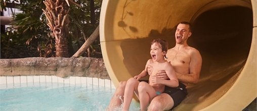Roetsj van verschillende glijbanen in de Aqua Mundo. Ga jij voor een snelle afdaling of liever een glijbaan waar je met de hele familie vanaf glijd?