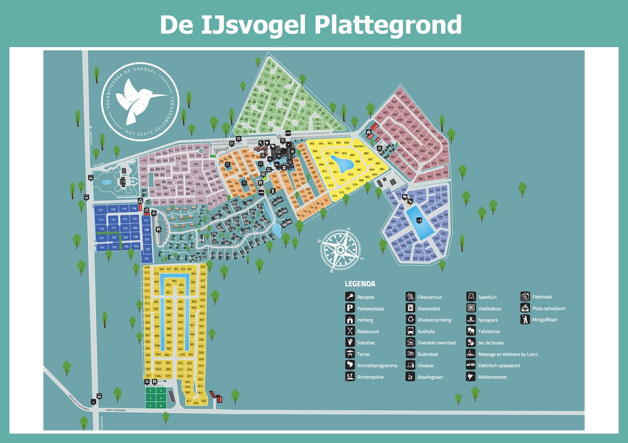 Actuele en overzichtelijke park plattegrond van De IJsvogel met alle huisjes en faciliteiten, ook te downloaden als PDF.