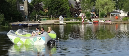 Bootje varen op innoverende wijze! Beweeg je samen voort in alle comfort in deze unieke lounge boot. Geniet van de luxe en ga rustig achterover liggen, je hoeft namelijk niet te peddelen; de boot is geheel elektrisch.