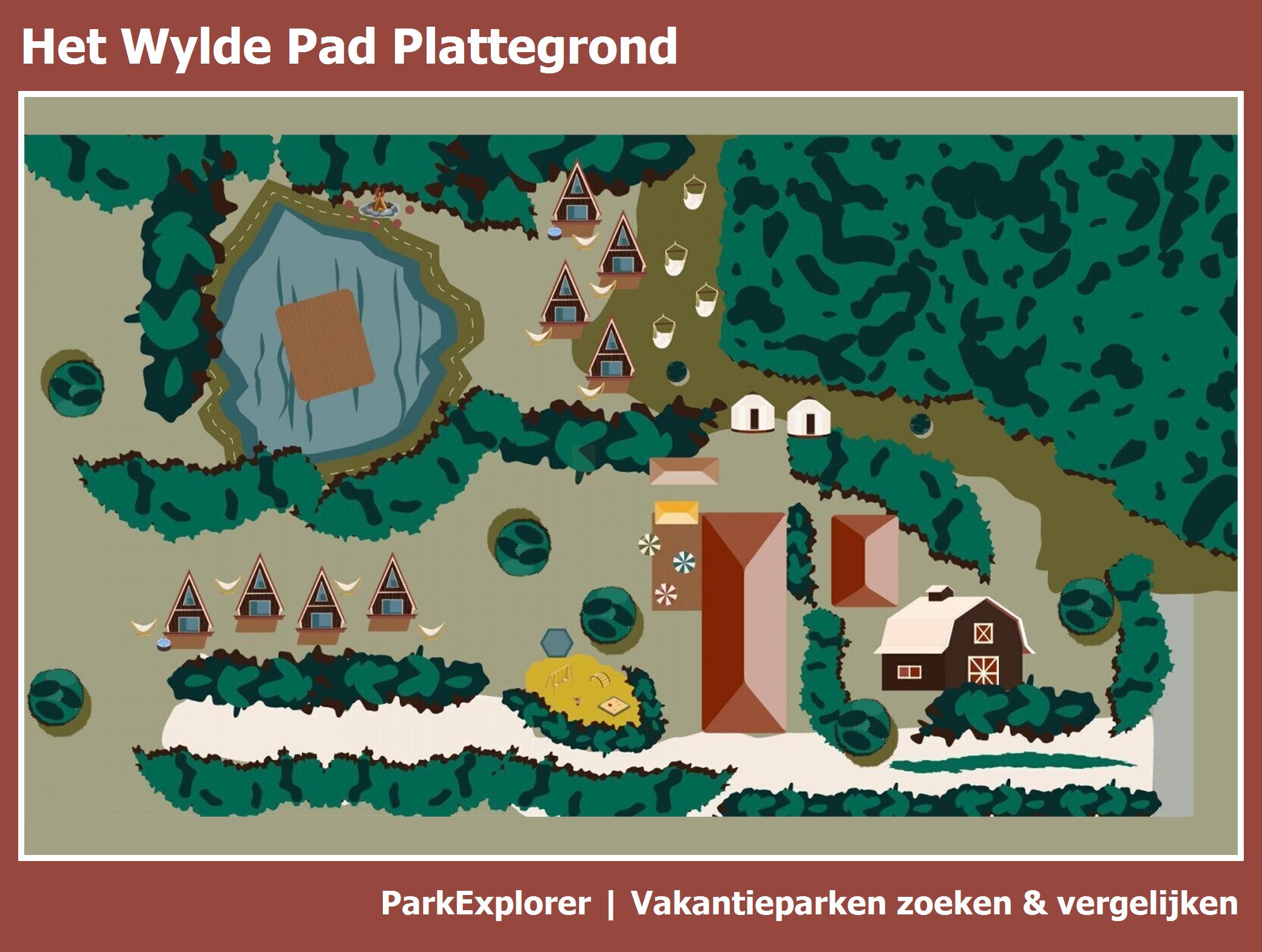 Actuele en overzichtelijke park plattegrond van Het Wylde Pad met alle huisjes en faciliteiten, ook te downloaden als PDF.