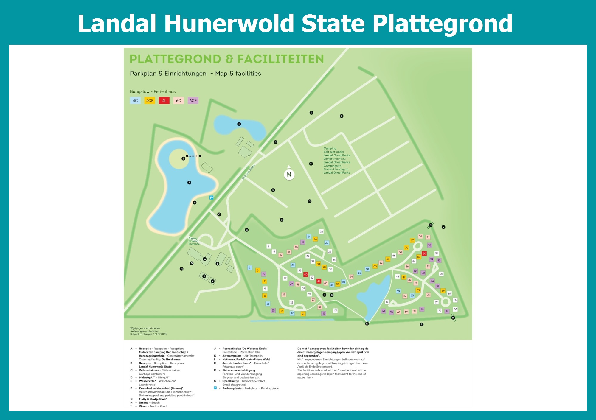 Actuele en overzichtelijke park plattegrond van Landal Hunerwold State met alle huisjes en faciliteiten, ook te downloaden als PDF.