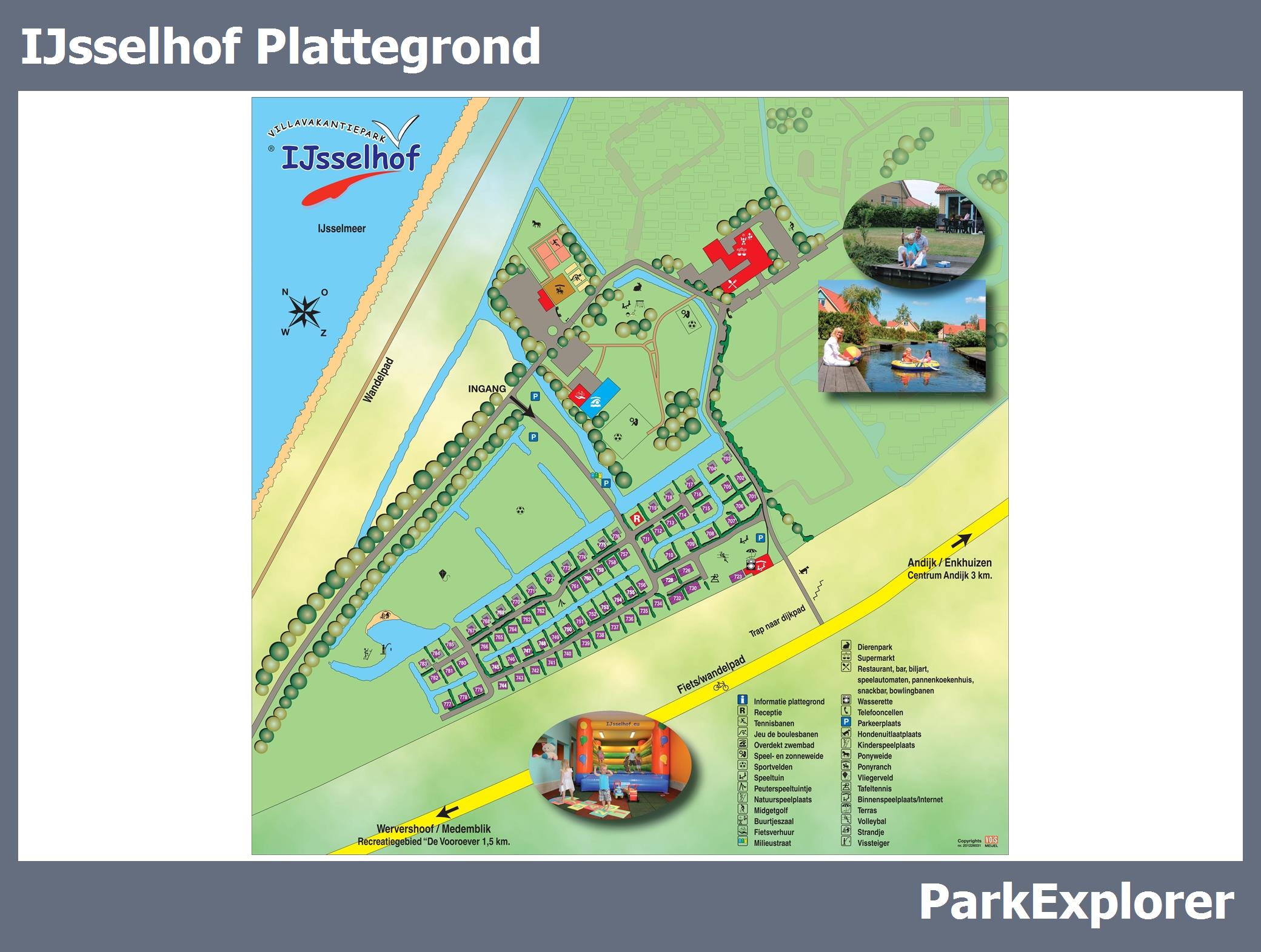 De park plattegrond van IJsselhof is niet alleen zeer handig tijdens het verblijf, maar vooral ook tijdens het boeken. De plattegrond geeft een goed beeld van de aanwezige faciliteiten en de ligging ervan op het park. TIP: Boek met voorkeursligging en kies een huisje in de buurt van de belangrijkste faciliteiten.