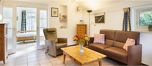 Begane grond: entree met hal en toilet. Volledig rolstoeltoegankelijke benedenverdieping. Ruime living met zit- en eethoek en o.a. een elektrisch verstelbare luxe fauteuil, flatscreen televisie en CD-speler. Open keuken met combimagnetron, koffiezetapparaat en vaatwasser. Slaapkamer met elektrisch verstelbaar hoog-laag bed met papegaai en bedhekken en elektrische bel naar de slaapkamers boven. Badkamer met wastafel en douche met losse po/douchestoel en toilet met zijsteunen. Terras met tuinmeubilair. Aparte berging. De accommodatie beschikt over een wasmachine.