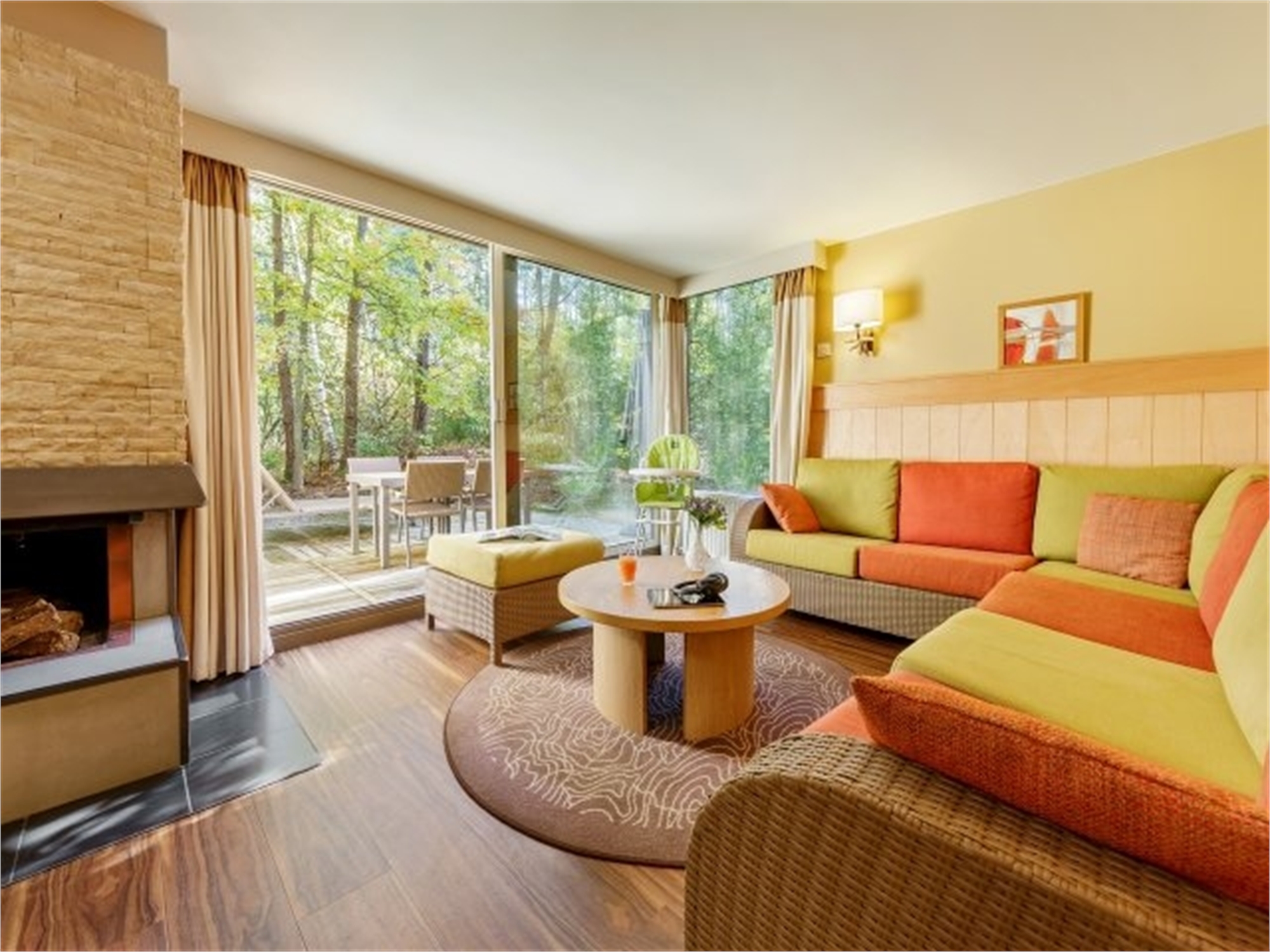 Woonkamer met open haard (gebruik uitsluitend het hout uit het pakket), flatscreen-tv, grote schuifpui naar het terras