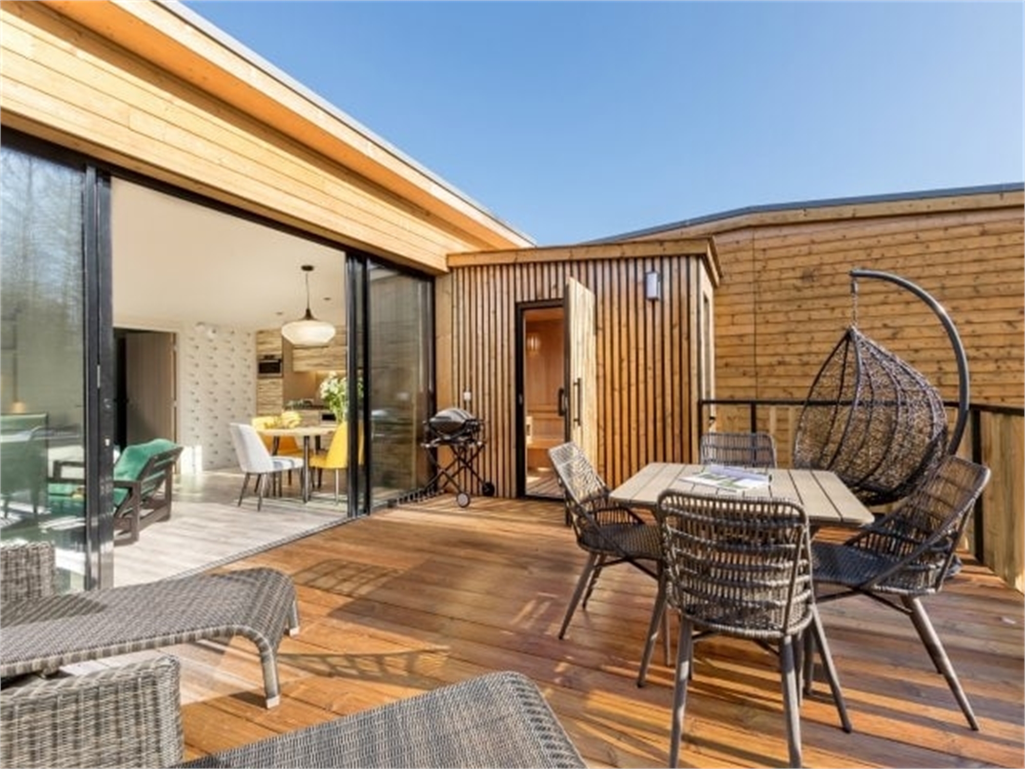 Een Exclusive vakantiehuis dat is genieten van meer comfort dankzij opgemaakte bedden en handdoeken. De vakantiehuizen beschikken over een woonkamer met televisie, uitgeruste keuken met vaatwasser, badkamer met infraroodsauna, slaapkamers en een eigen tuin met tuinmeubels.