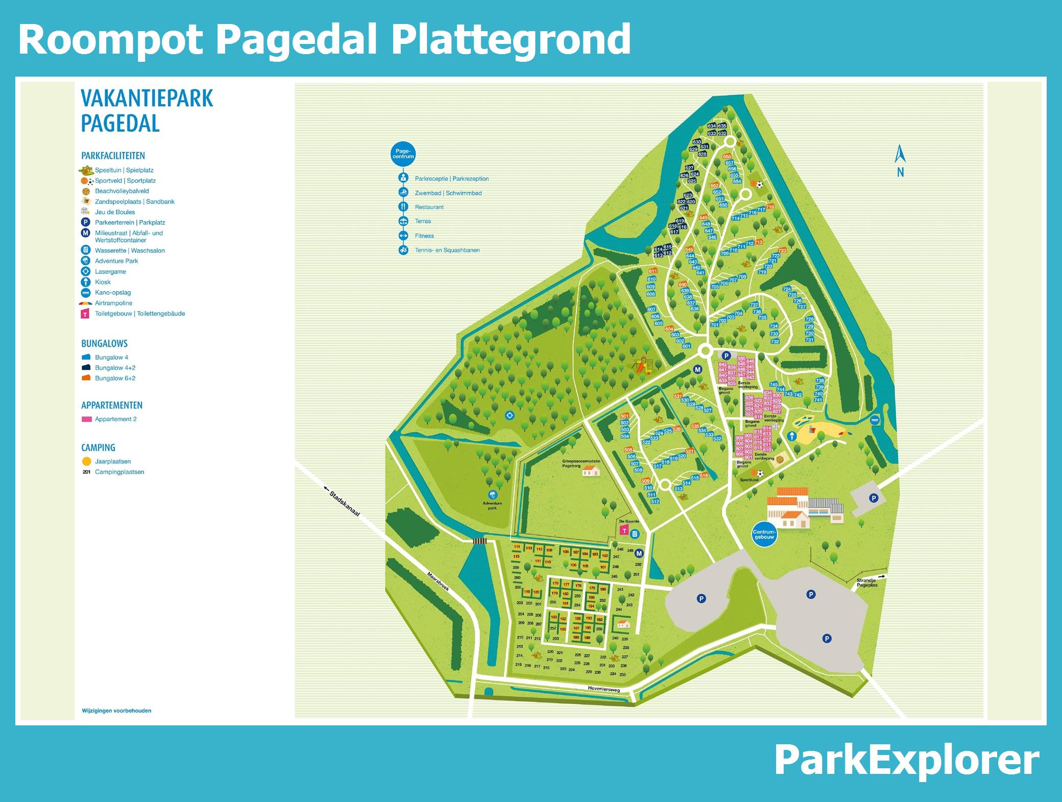 De park plattegrond van Pagedal is niet alleen zeer handig tijdens het verblijf, maar vooral ook tijdens het boeken. De plattegrond geeft een goed beeld van de aanwezige faciliteiten en de ligging ervan op het park. TIP: Boek met voorkeursligging en kies een huisje in de buurt van de belangrijkste faciliteiten.