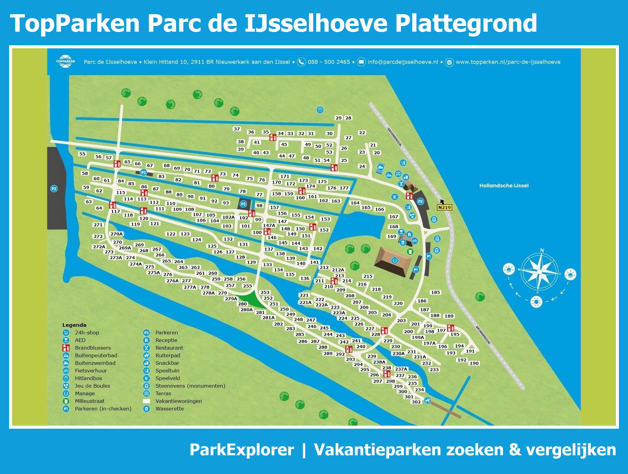 Actuele en overzichtelijke park plattegrond van TopParken Parc de IJsselhoeve met alle huisjes en faciliteiten, ook te downloaden als PDF.