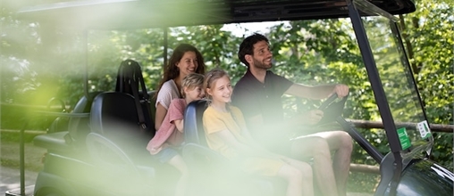 In een E-car rijd je geruisloos door het park. De E-car is bovendien ook nog natuurvriendelijk en praktisch. Boodschappen, strandtassen: alles past erin!
