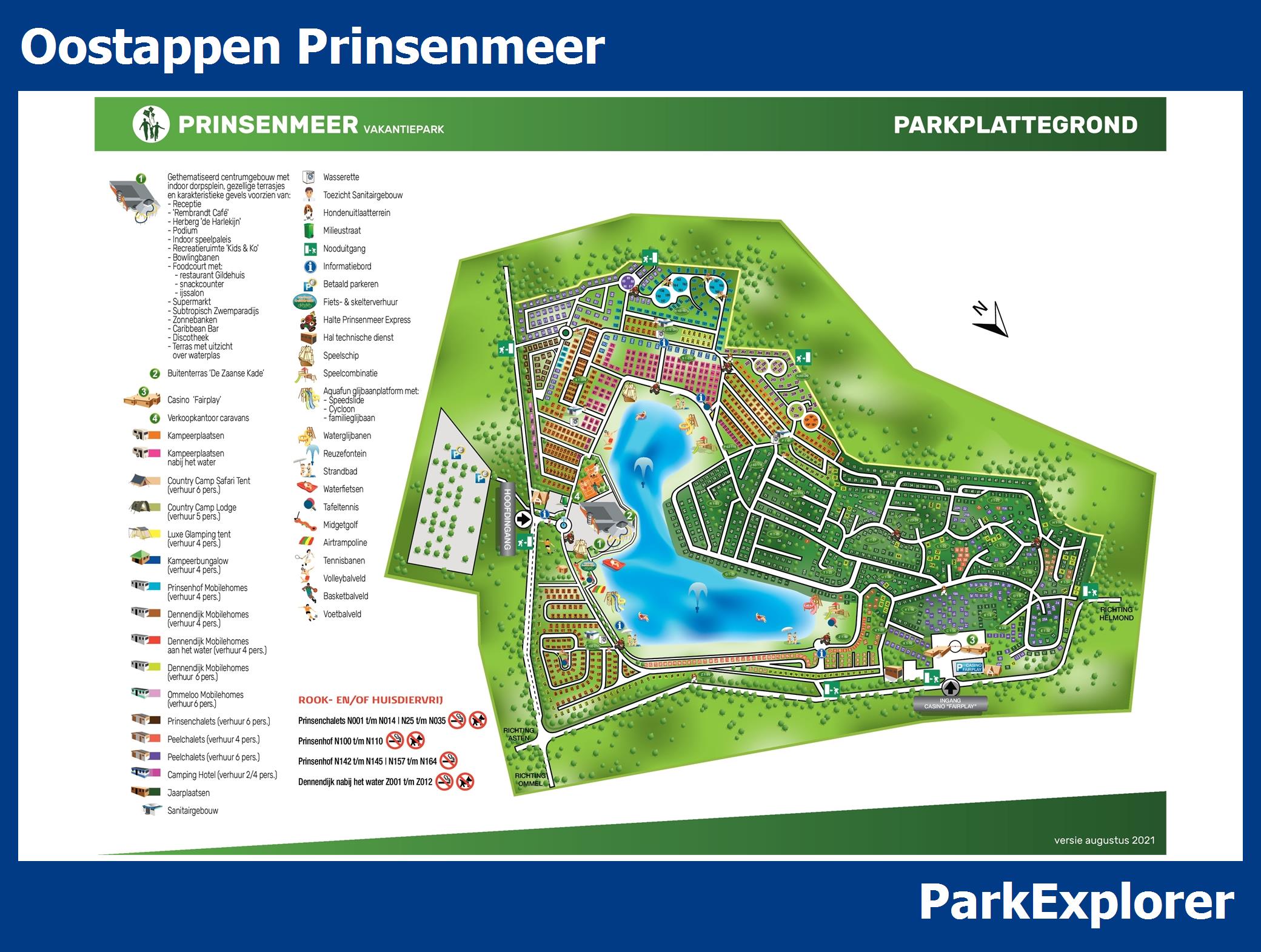 De park plattegrond van Oostappen Prinsenmeer is niet alleen zeer handig tijdens het verblijf, maar vooral ook tijdens het boeken. De plattegrond geeft een goed beeld van de aanwezige faciliteiten en de ligging ervan op het park. TIP: Boek met voorkeursligging en kies een huisje in de buurt van de belangrijkste faciliteiten.