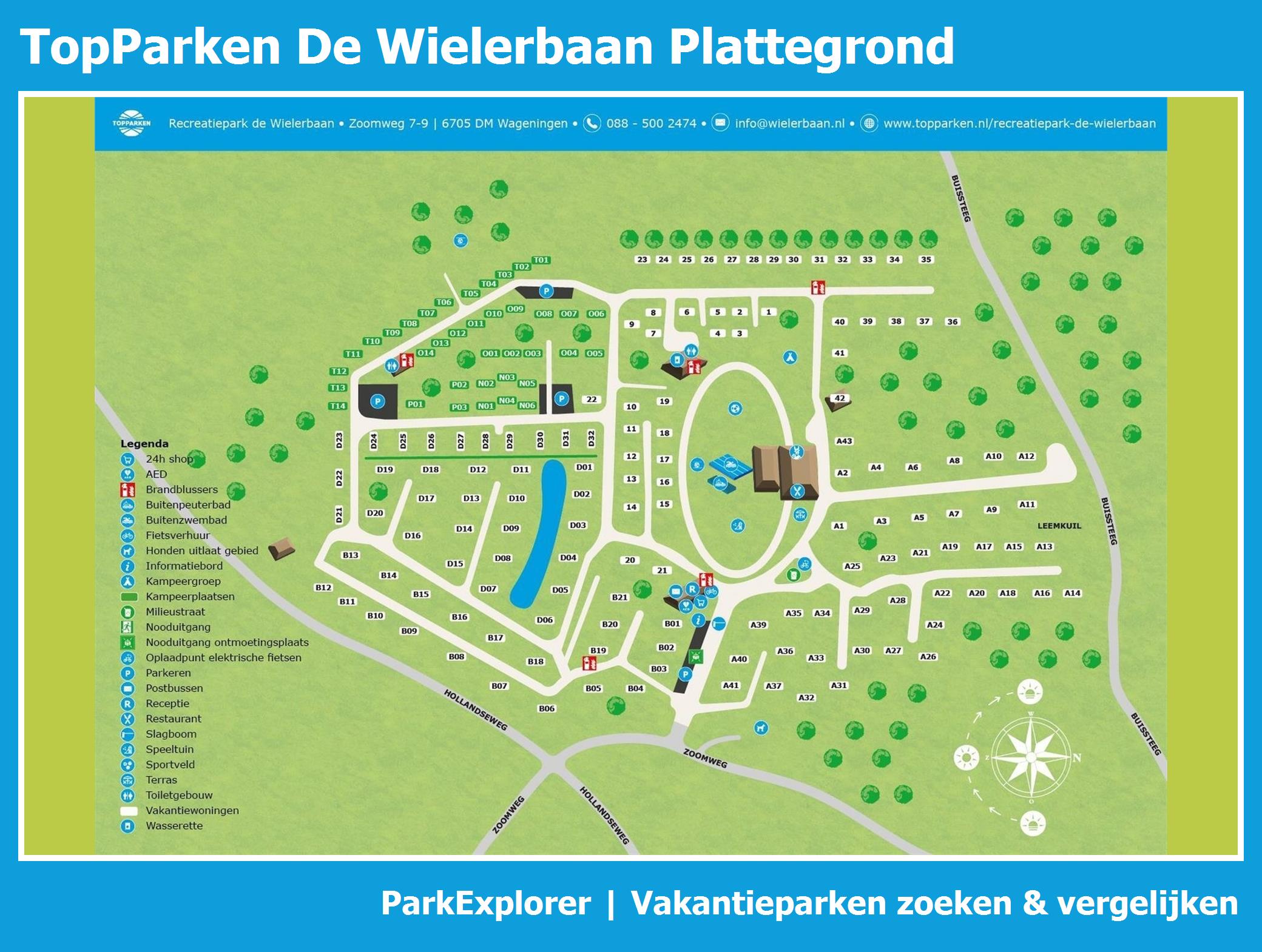 Actuele en overzichtelijke park plattegrond van TopParken De Wielerbaan met alle huisjes en faciliteiten, ook te downloaden als PDF.