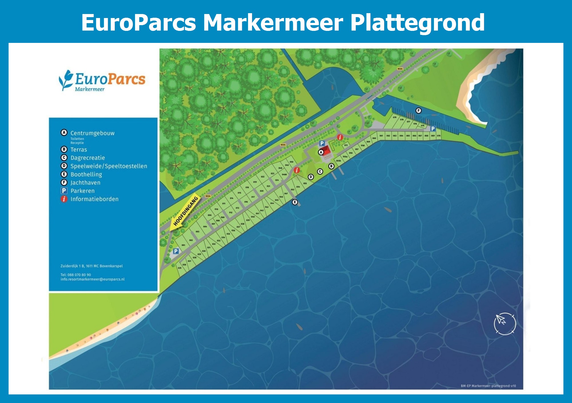 Actuele en overzichtelijke park plattegrond van EuroParcs Markermeer met alle huisjes en faciliteiten, ook te downloaden als PDF.