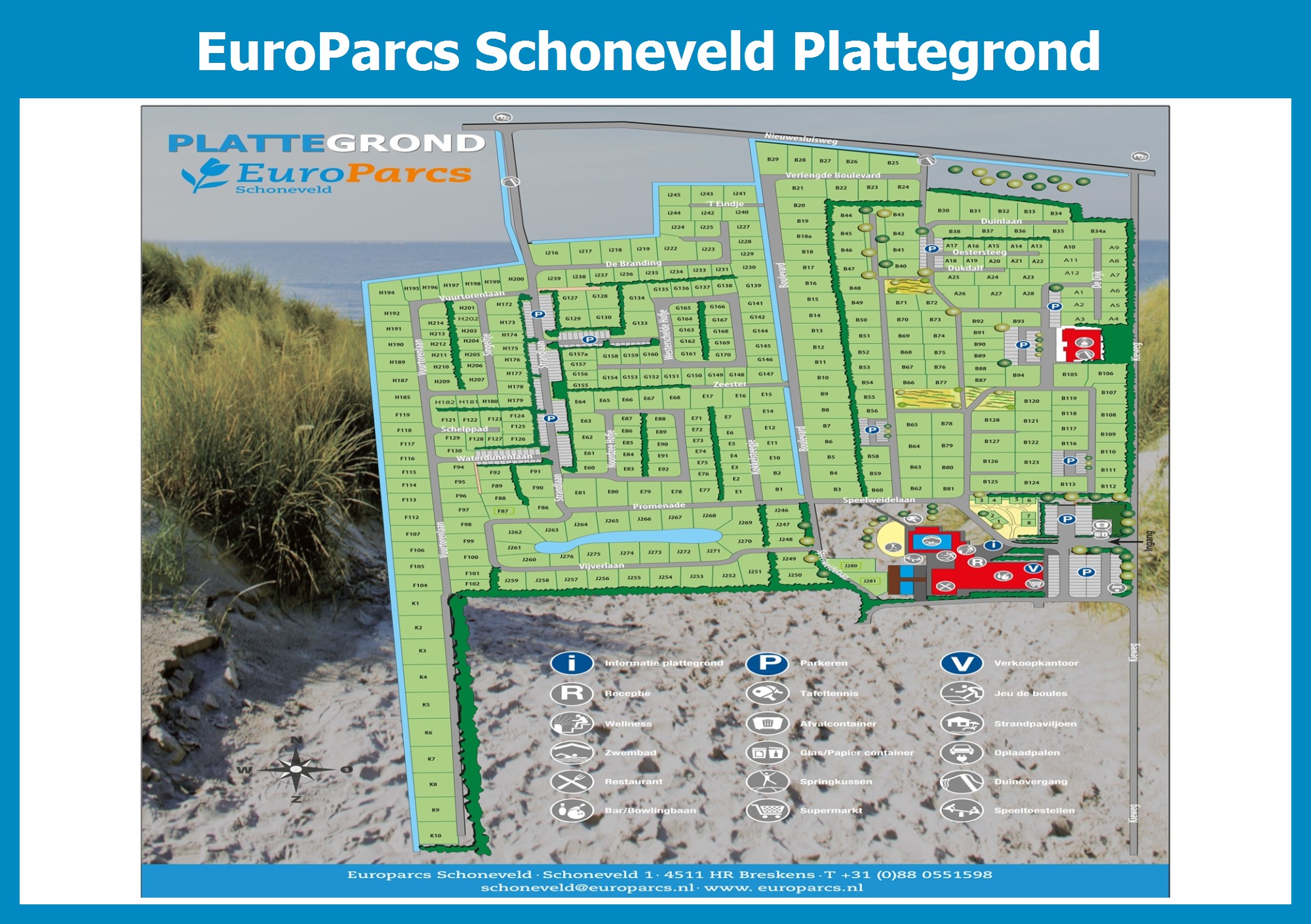 De park plattegrond van EuroParcs Schoneveld is niet alleen zeer handig tijdens het verblijf, maar vooral ook tijdens het boeken. De plattegrond geeft een goed beeld van de aanwezige faciliteiten en de ligging ervan op het park. TIP: Boek met voorkeursligging en kies een huisje in de buurt van de belangrijkste faciliteiten.