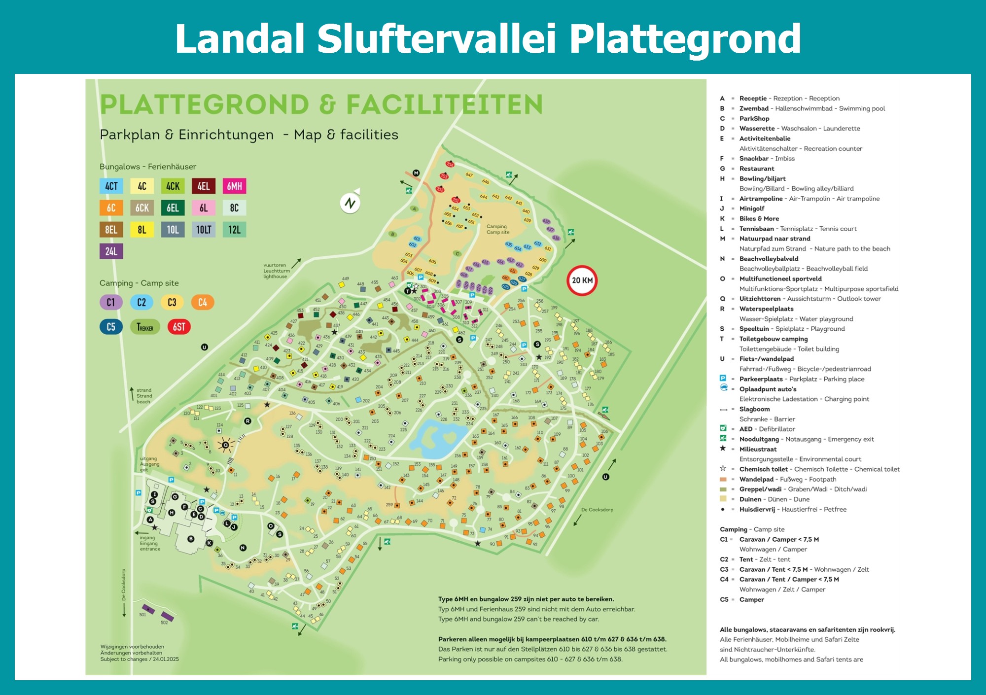 Actuele en overzichtelijke park plattegrond van Landal Sluftervallei met alle huisjes en faciliteiten, ook te downloaden als PDF.
