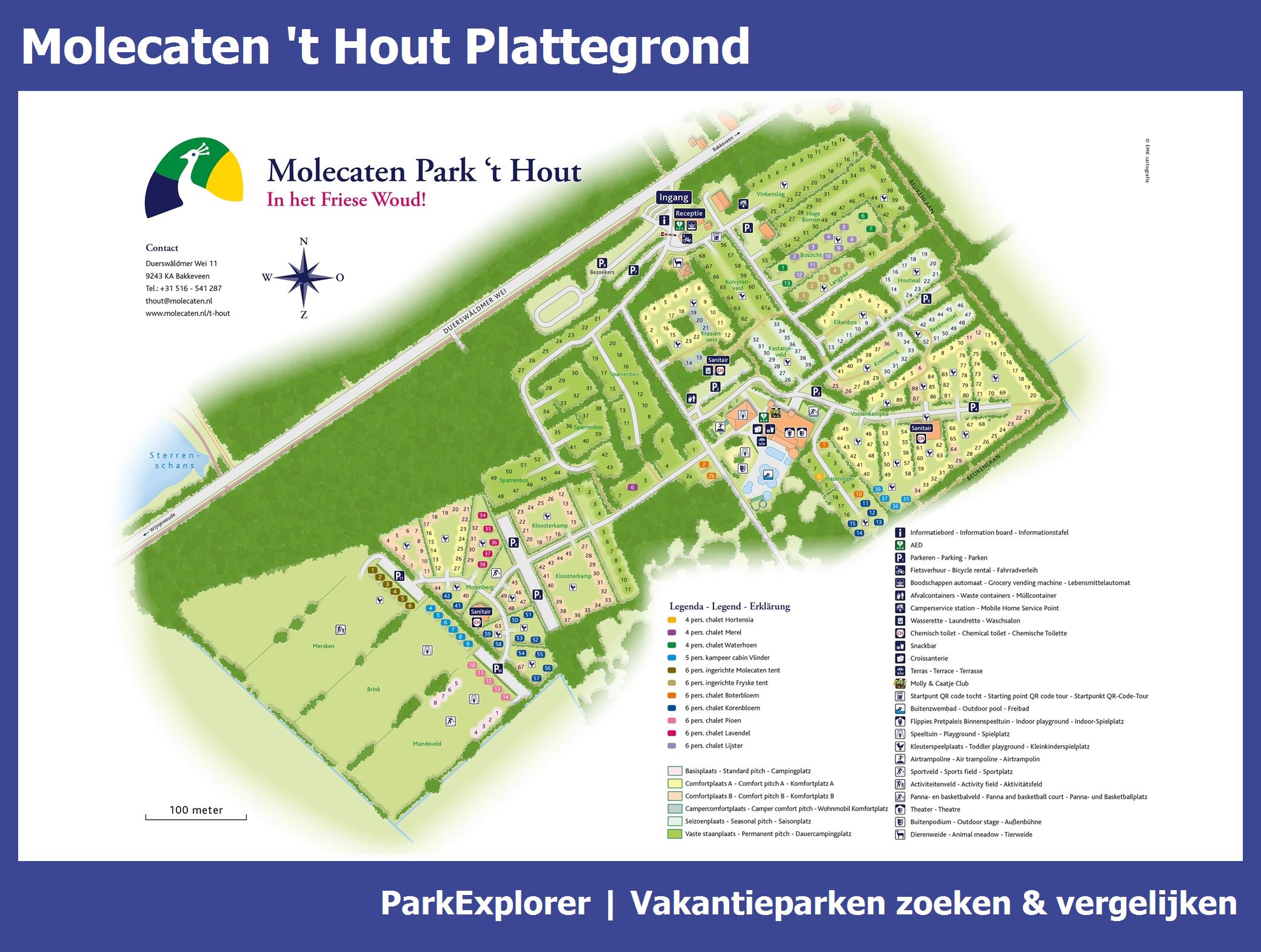 Actuele en overzichtelijke park plattegrond van Molecaten 't Hout met alle huisjes en faciliteiten, ook te downloaden als PDF.