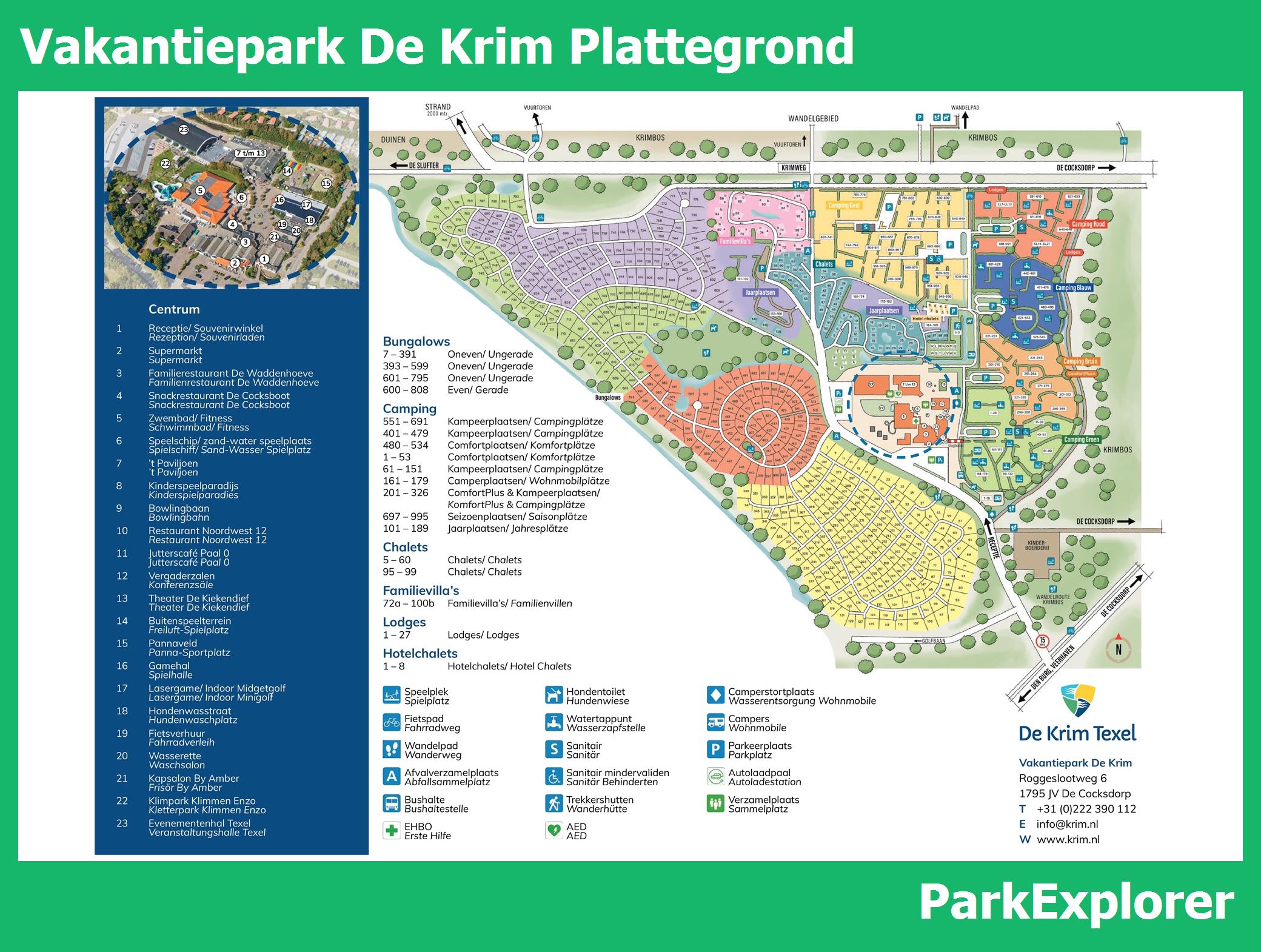 De park plattegrond van De Krim is niet alleen zeer handig tijdens het verblijf, maar vooral ook tijdens het boeken. De plattegrond geeft een goed beeld van de aanwezige faciliteiten en de ligging ervan op het park. TIP: Boek met voorkeursligging en kies een huisje in de buurt van de belangrijkste faciliteiten.