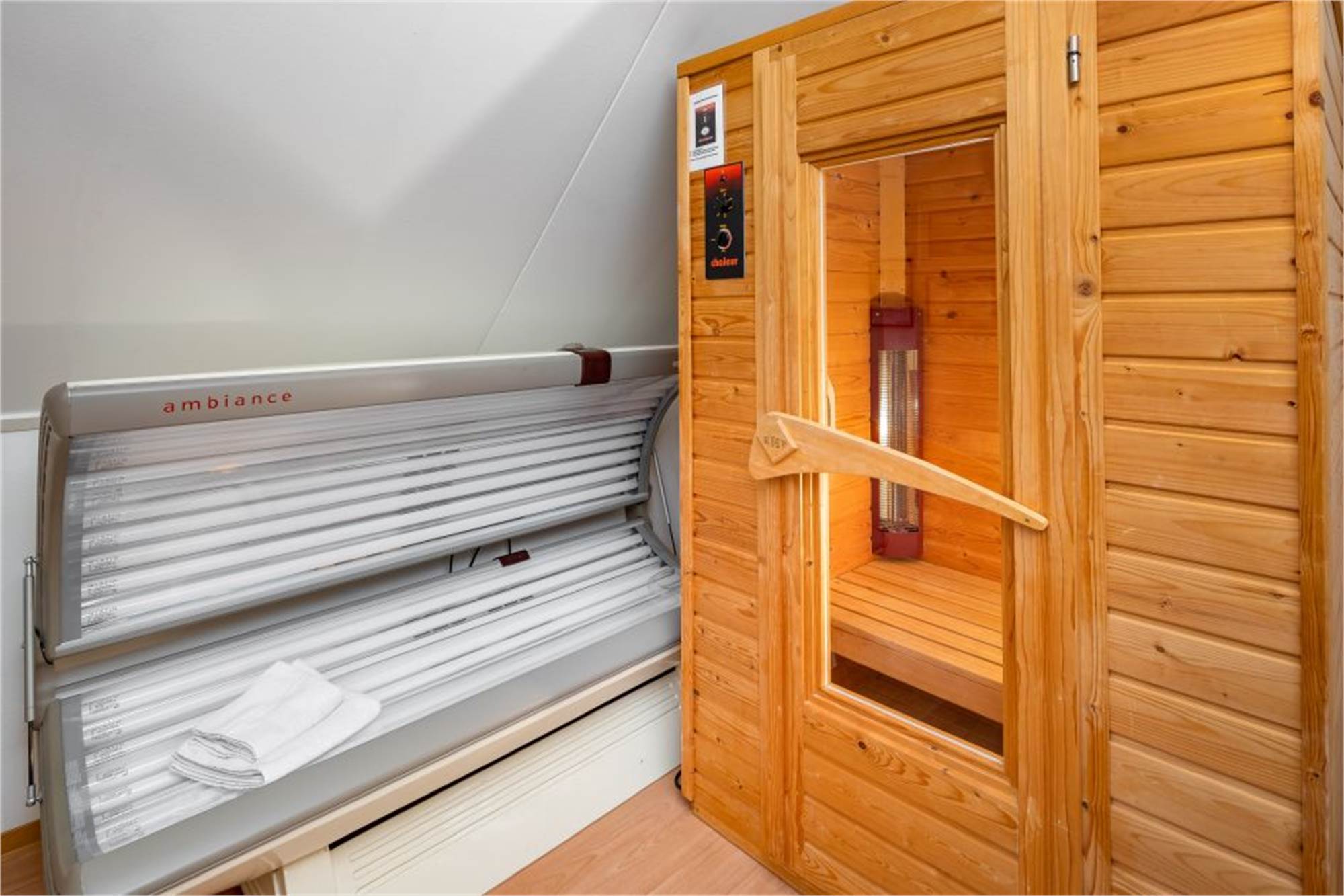 Verdieping: twee slaapkamers, waarvan één met wastafel en twee éénpersoonsboxspring bedden. De andere slaapkamer beschikt over een éénpersoonsbed, infrarood sauna en zonnebank. Bij de trap kan een traphekje geplaatst worden.