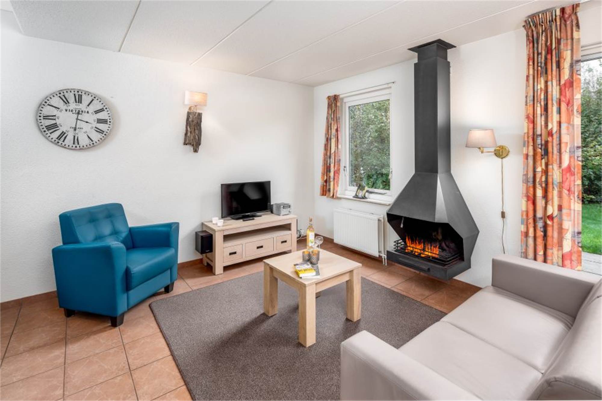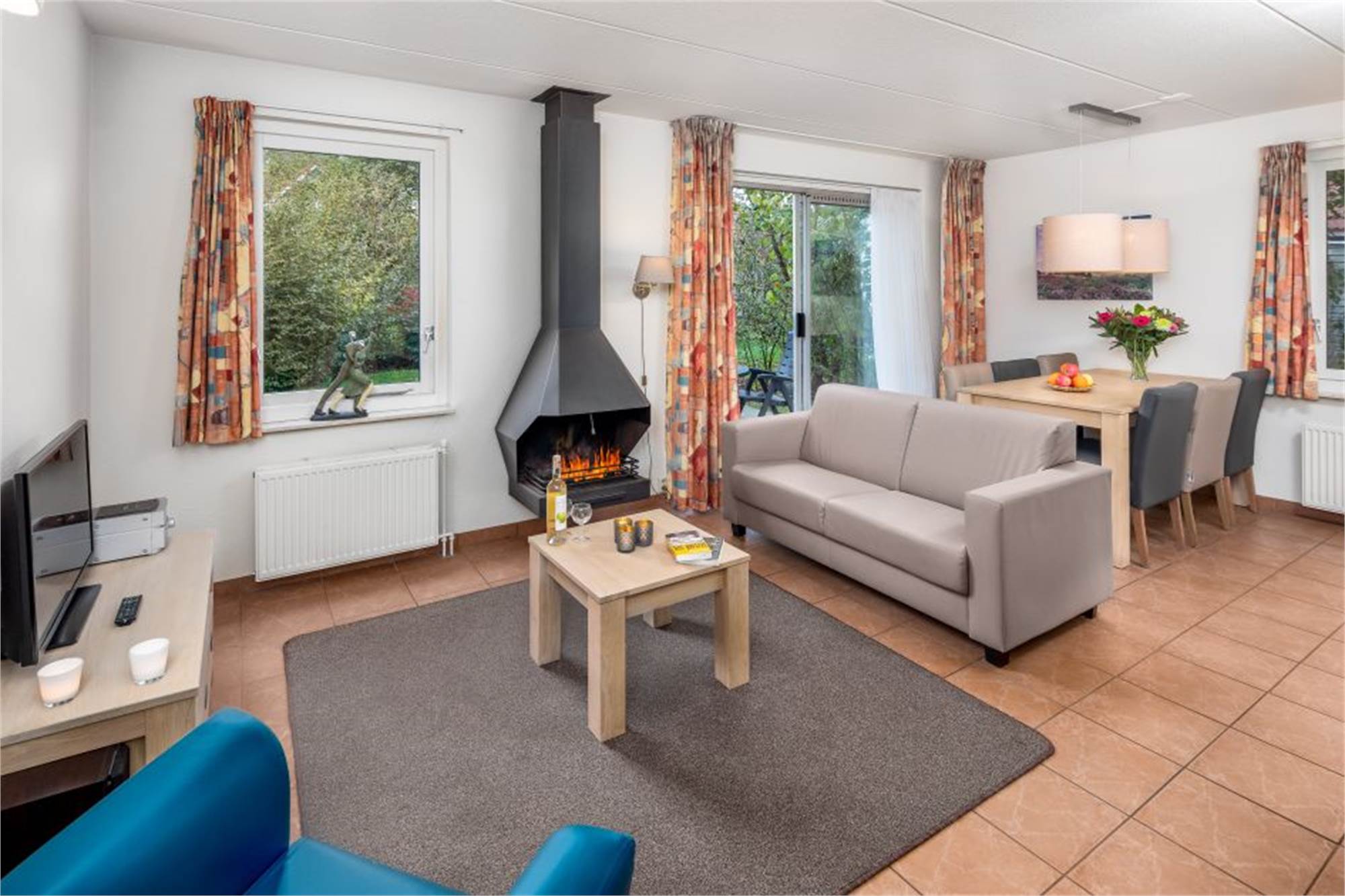Begane grond: woonkamer met comfortabel meubilair en openhaard, houtkachel of sfeerhaard. Schuifpui naar het gemeubileerde terras. Compleet ingerichte keuken met koffiepadapparaat, combimagnetron en vaatwasser. Slaapkamer met twee éénpersoonsboxspring bedden naast elkaar geplaatst. Badkamer met wastafel en douche. Apart toilet. Open berging bij de ingang voor stalling van o.a. fietsen.