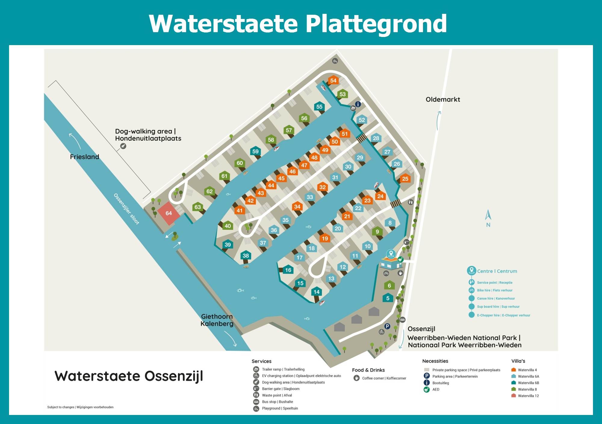 Actuele en overzichtelijke park plattegrond van Waterstaete met alle huisjes en faciliteiten, ook te downloaden als PDF.
