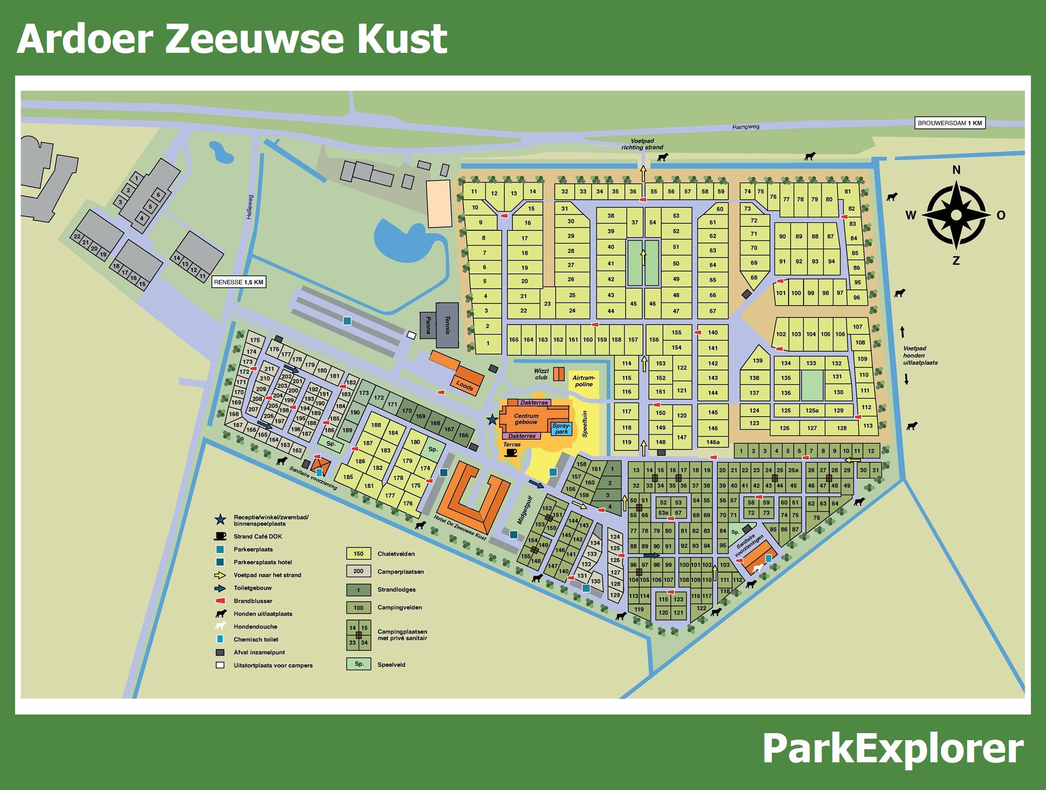 De park plattegrond van Ardoer Zeeuwse Kust is niet alleen zeer handig tijdens het verblijf, maar vooral ook tijdens het boeken. De plattegrond geeft een goed beeld van de aanwezige faciliteiten en de ligging ervan op het park. TIP: Boek met voorkeursligging en kies een huisje in de buurt van de belangrijkste faciliteiten.